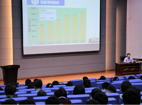 王康军院长报告结束,余海军书记从近年的考研人数和学院近几年考研率变化情况为同学们分析了当前考研形势,他指出如今考研的人数在不断增加,考研面临的挑战也越来越多。他希望同学们能够不惧挑战,认清自我需求,提升自我竞争力,实现自己的考研目标。
